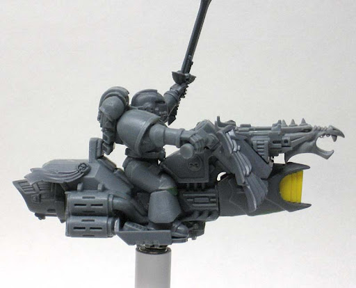 Time to mount the kick plate and “engine” (from the Dark Eldar jetbike) to the bottom of the body of the bike. Remember to mount the kick plate flush with the bottom of the bike (See Step 3). The engine should fit flush with the front of the kick plate.